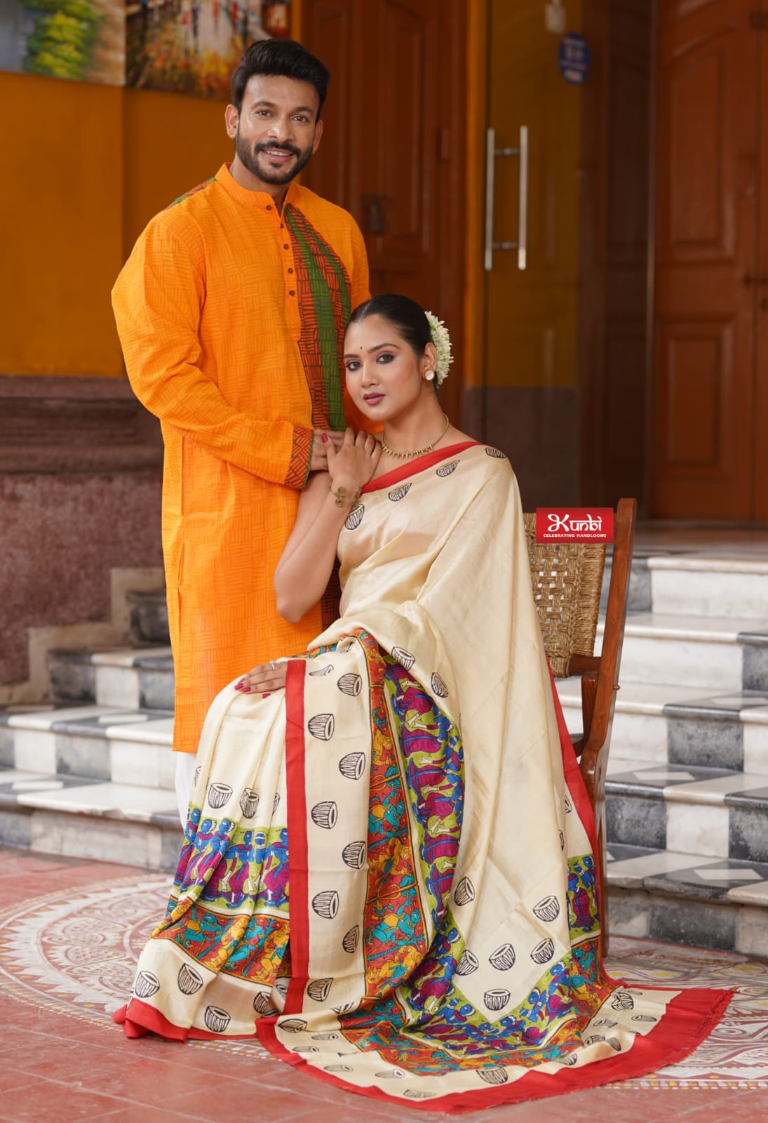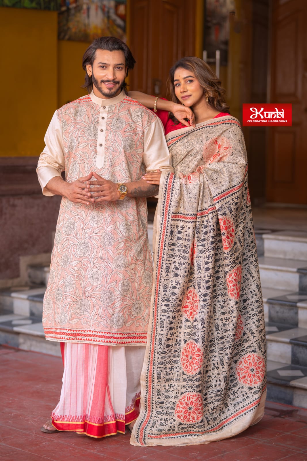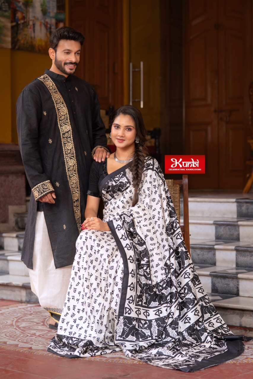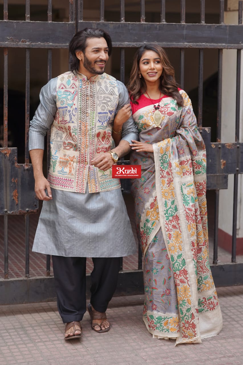 Tussar Kantha Stitch Saree with Kantha Stitch kurta and Dhonekhali dhoti kurta and